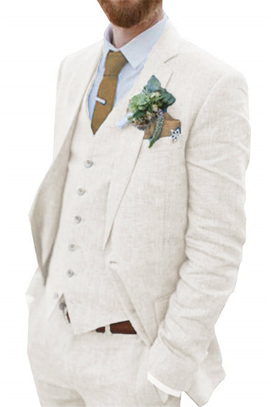 Ivory White Retro Linen Beach Wedding Summer 3 Pieces Men Suits