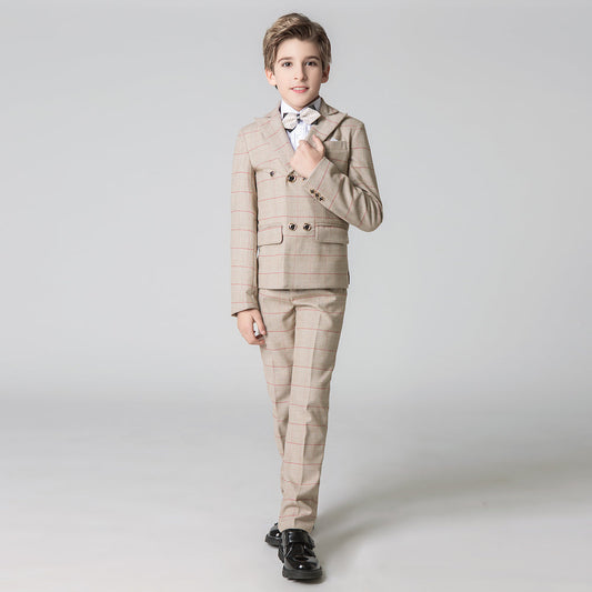 Khaki Plaid Elegant Formal 5 Piece Boys Suits