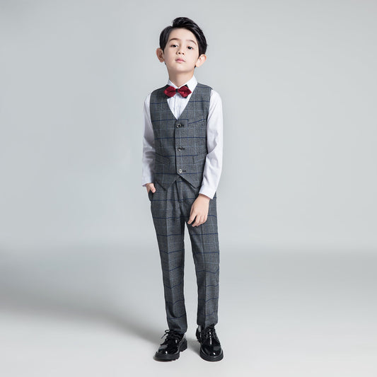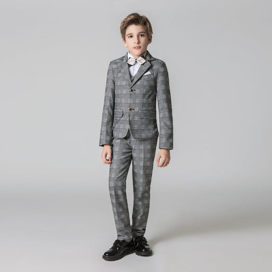 Dark Gray Plaid Fashion 5 Piece Boys Suits