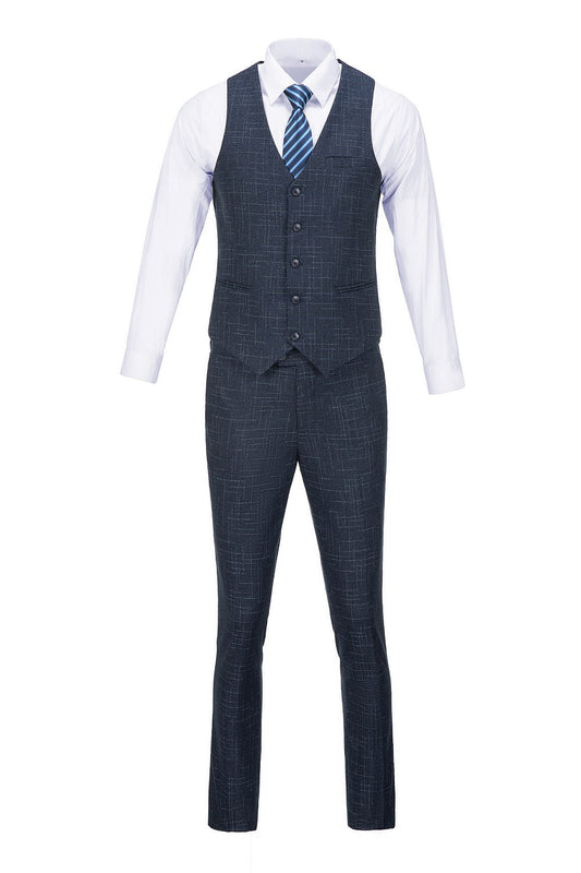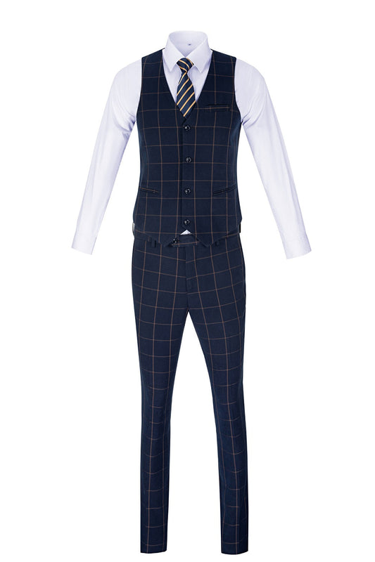 Navy Plaid Men's 3 Piece Slim Fit Suit Set