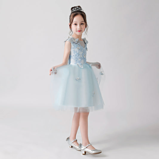 Hellblaues, bauschiges Chiffonkleid mit Schmetterlingsdruck und Stickereien für Blumenmädchen für Hochzeiten, Partys und besondere Anlässe FLC3172