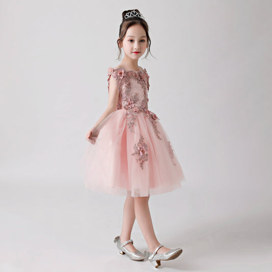 Rosa, mit Rosenmuster besticktes Chiffon-Ponchokleid für Blumenmädchen für Hochzeit, Party, Anlässe FLC3173