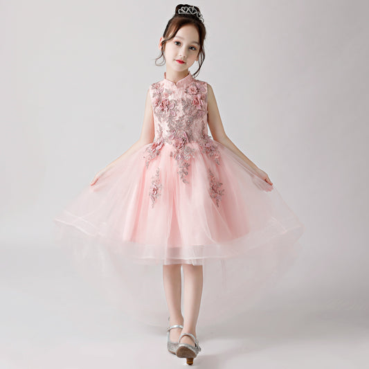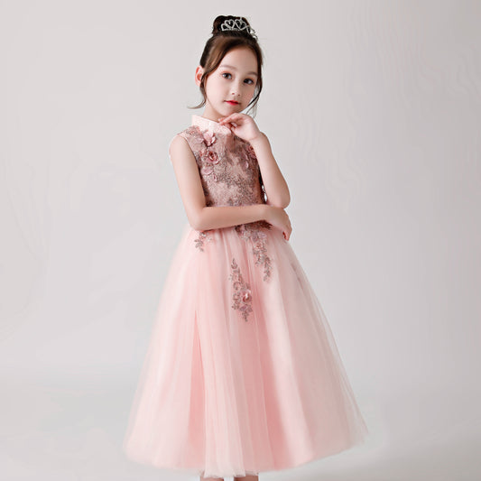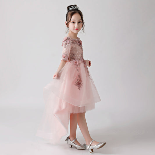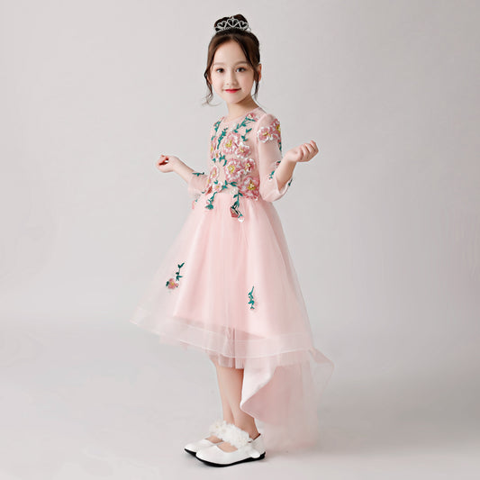Langes Chiffonkleid für Blumenmädchen mit besticktem Rosendruck in Rosa für Hochzeit, Party, besondere Anlässe FLC3174