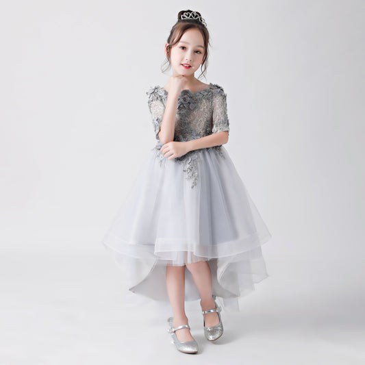 Silbergraues, besticktes, bedrucktes Chiffon-Blumenmädchenkleid für Hochzeit, Party, Anlässe FLC3170